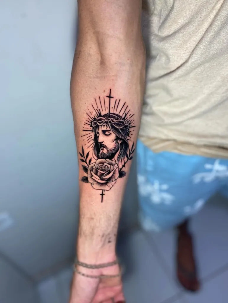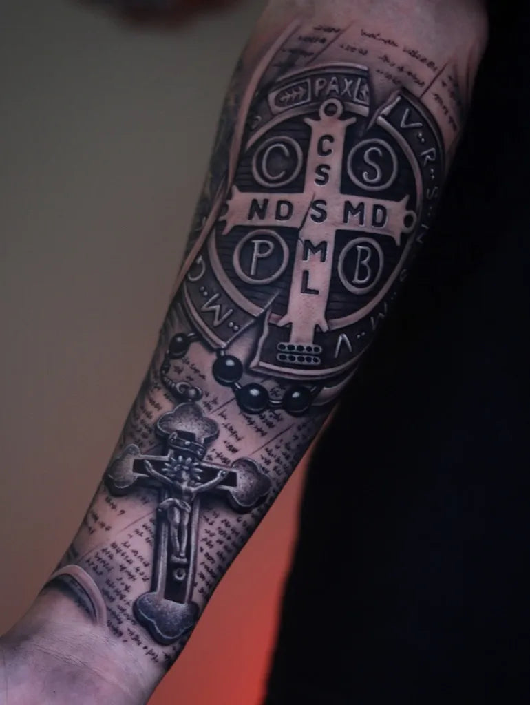 - Upper arm or shoulder: Room for rays, banners, or scripture around your 3 cross tattoo.