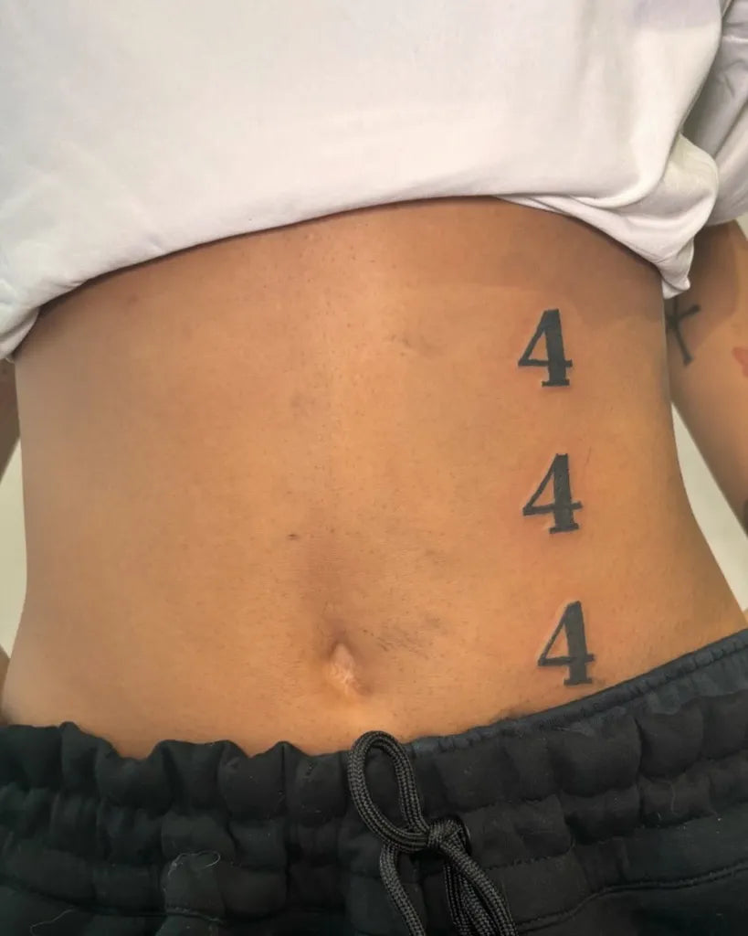 Small Black and Grey 444 on Women Abdomen Tattoo by @inkedbybleuu