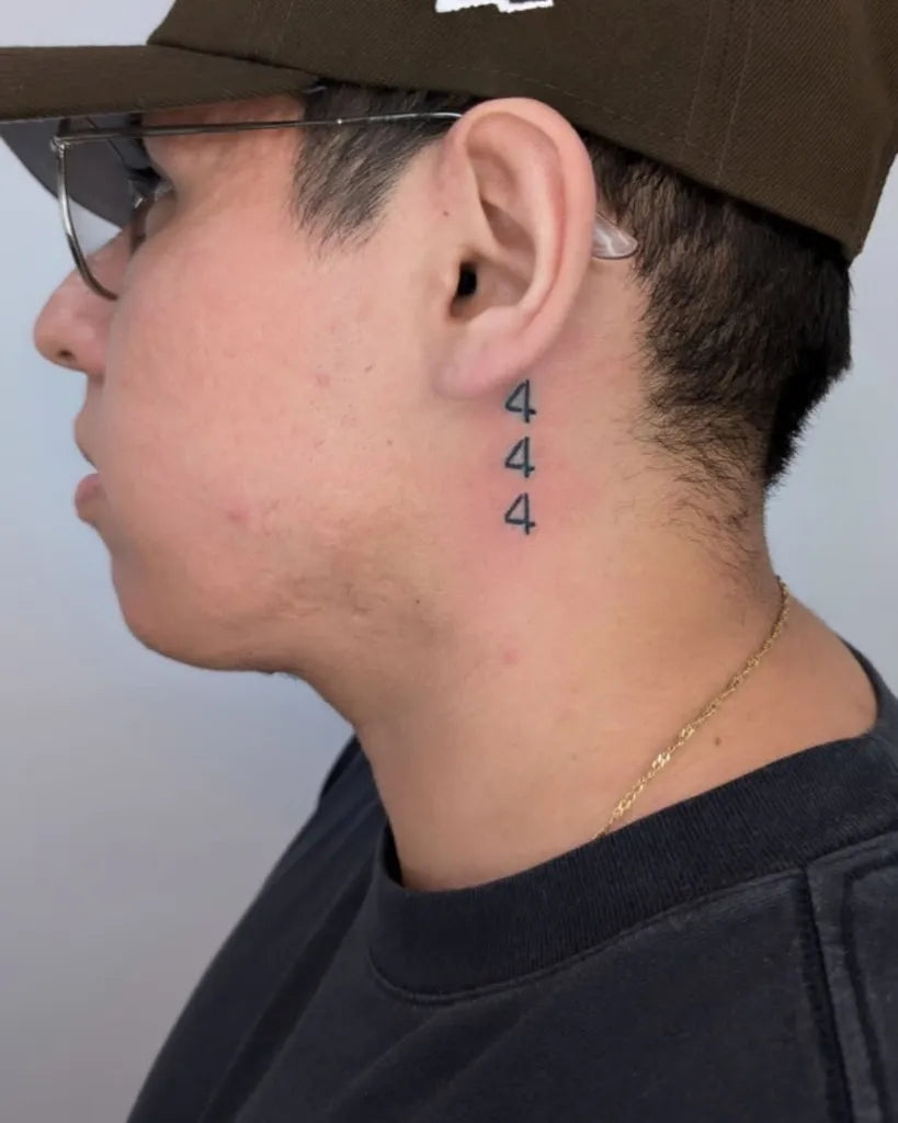Small Minimalist 444 on Men Neck Tattoo by @eighthelementtattoo