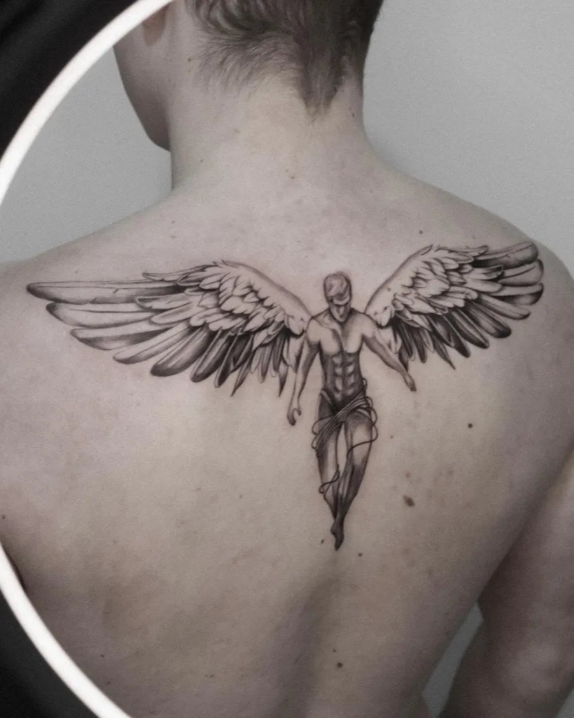 Big Black and Grey Angel with Wings Tattoo on Men Back by @inkednita