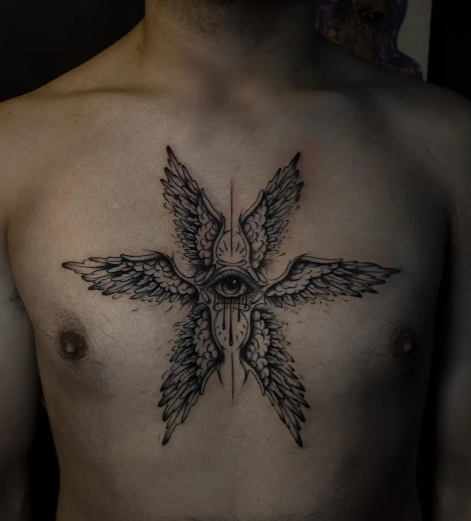 Medium Black and Grey Angel Wings Eye Tattoo on Men Chest by @chico.choo