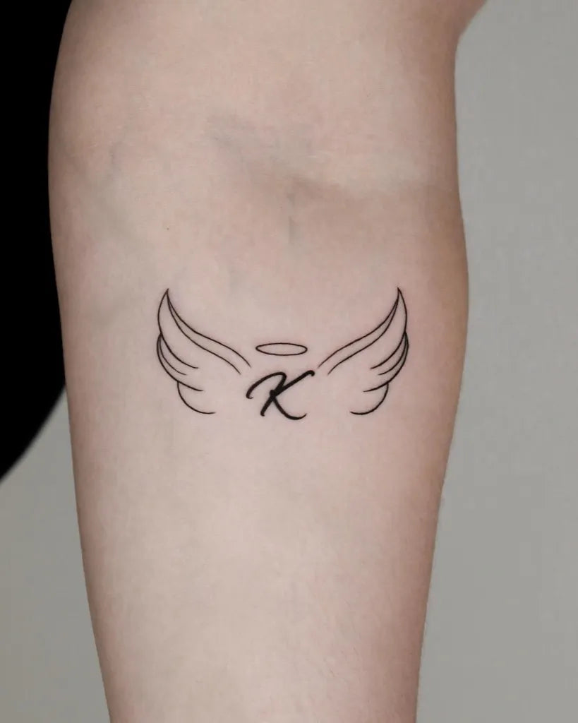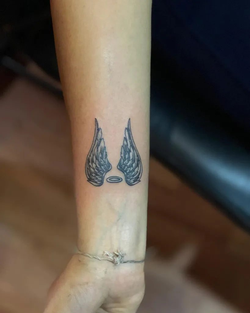 Small Minimalist Angel Wings Halo K Women Forearm by @darlingg.tattoo