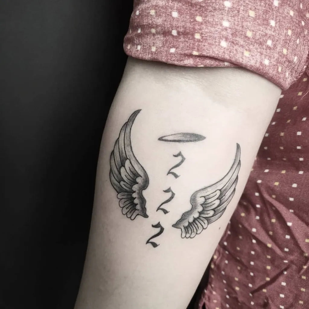 Small Black and Grey Angel Wings with Halo and 222 Tattoo on Women Arm by @tejas_2804_