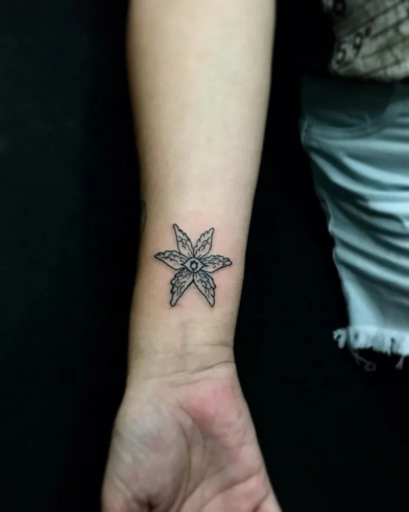 Small Blackwork Angel Wings and Initial Tattoo on Women Wrist by @aroncowlestattoo