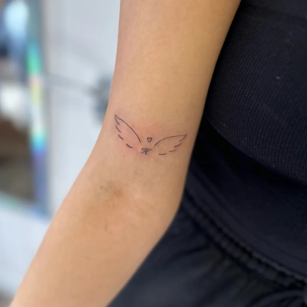 Small Fine Line Angel Wings Tattoo on Women Arm by @rayanetattoos