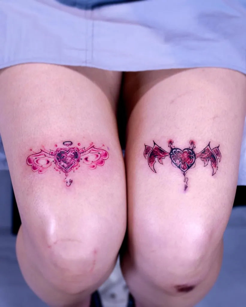 Small New School Angel Wings Heart Tattoo on Women Knees by @kitsch_tattooer