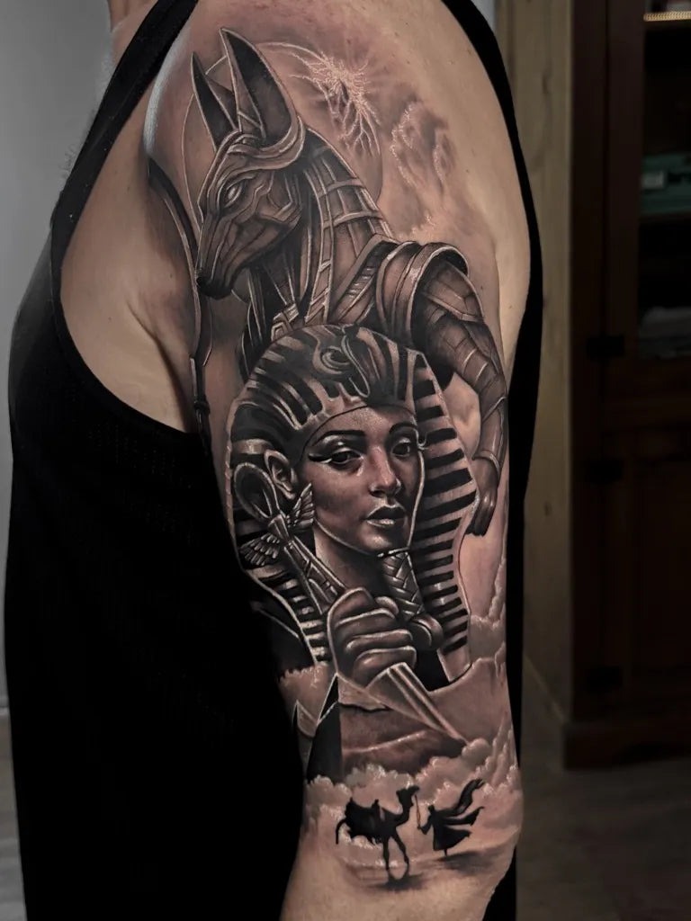 Big Black and Grey Anubis Pharaoh Horse Tattoo on Men Shoulder by @odiegosamuel