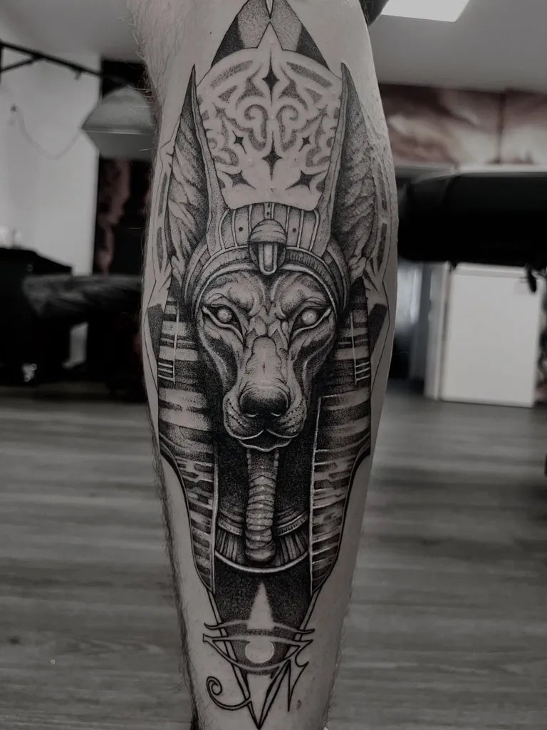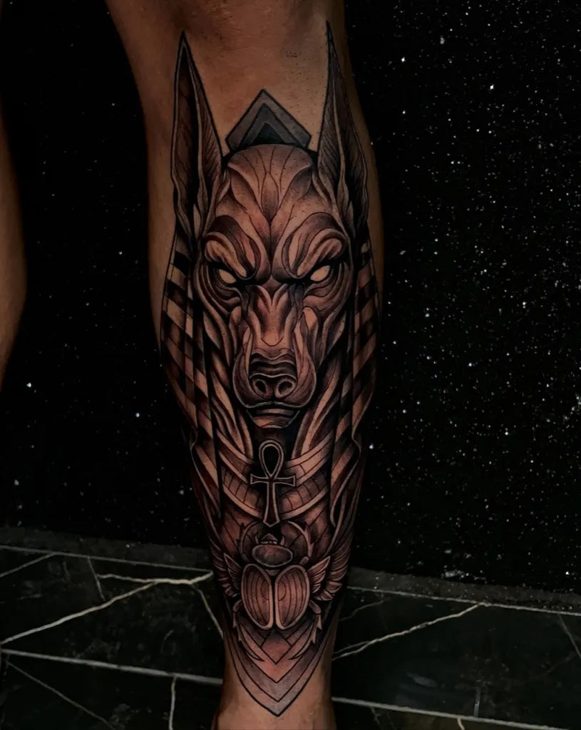 Big Black and Grey Anubis Tattoo on Men Leg by @katisaurus_tattoo
