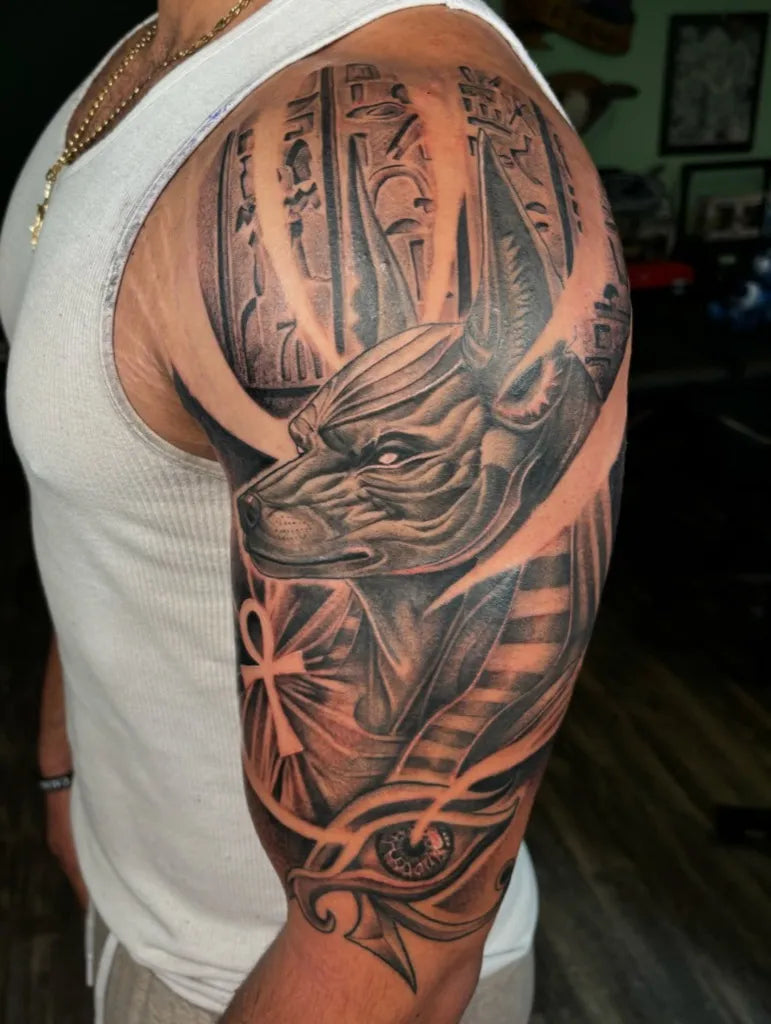 Big Black and Grey Anubis with Ankh and Eye of Horus Tattoo on Men Arm by @enso.inks