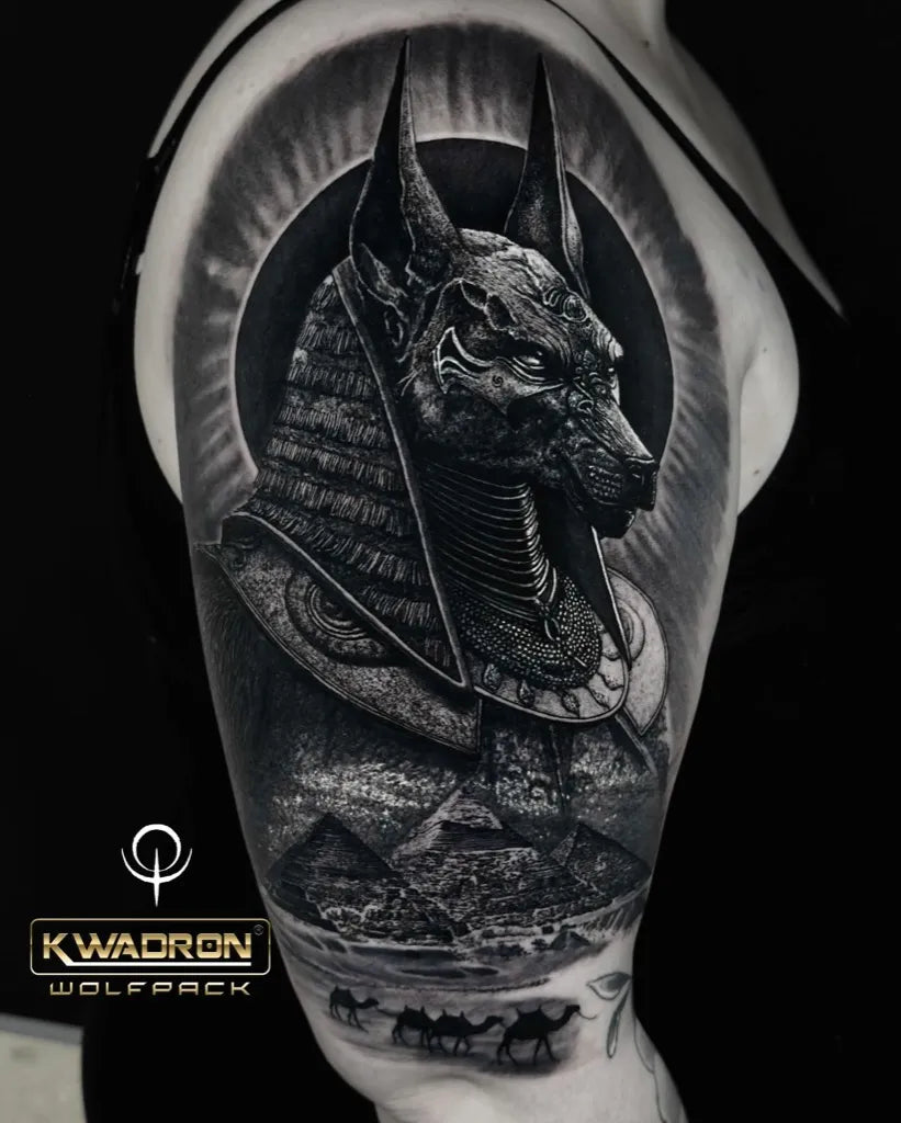 Big Black and Grey Anubis with Pyramids Tattoo on Women Shoulder by @etgaroak