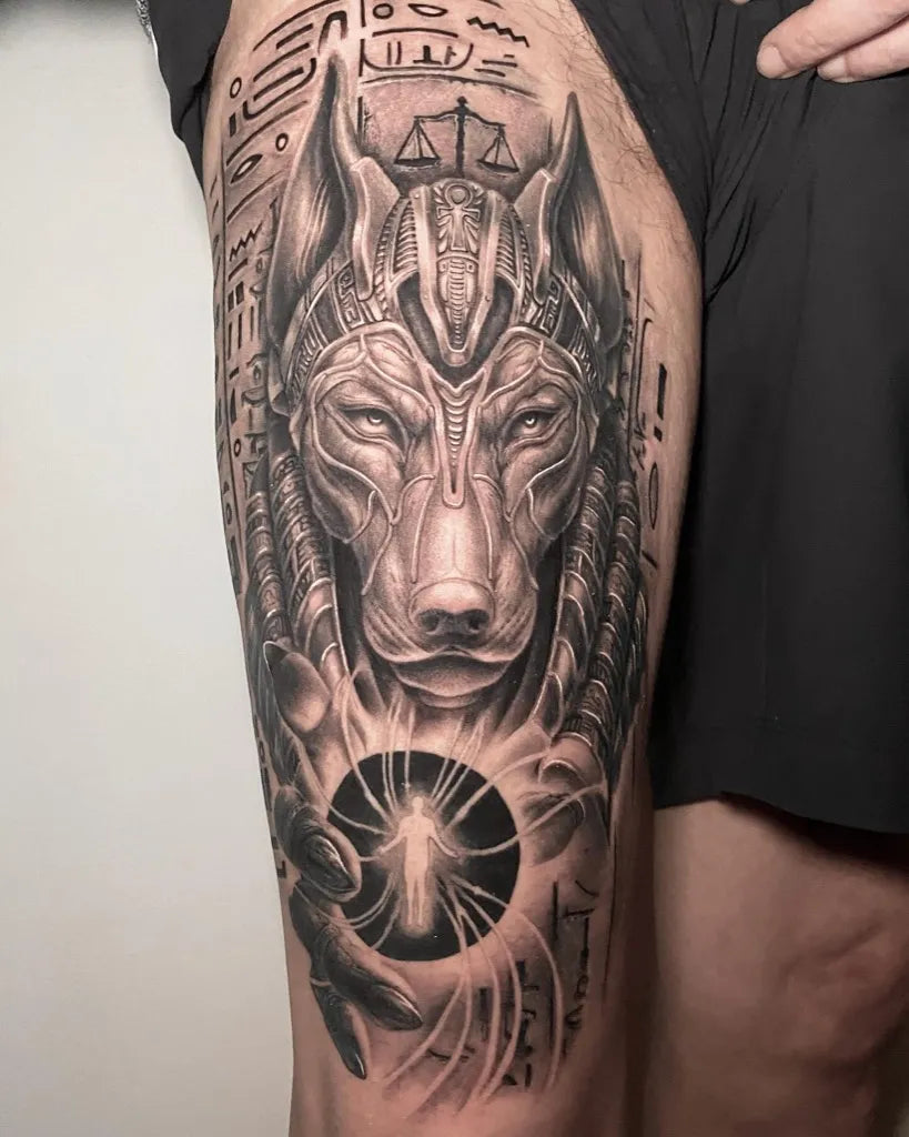 Big Black and Grey Anubis with Egyptian Motifs Tattoo on Men Thigh by @chinox.tattoo