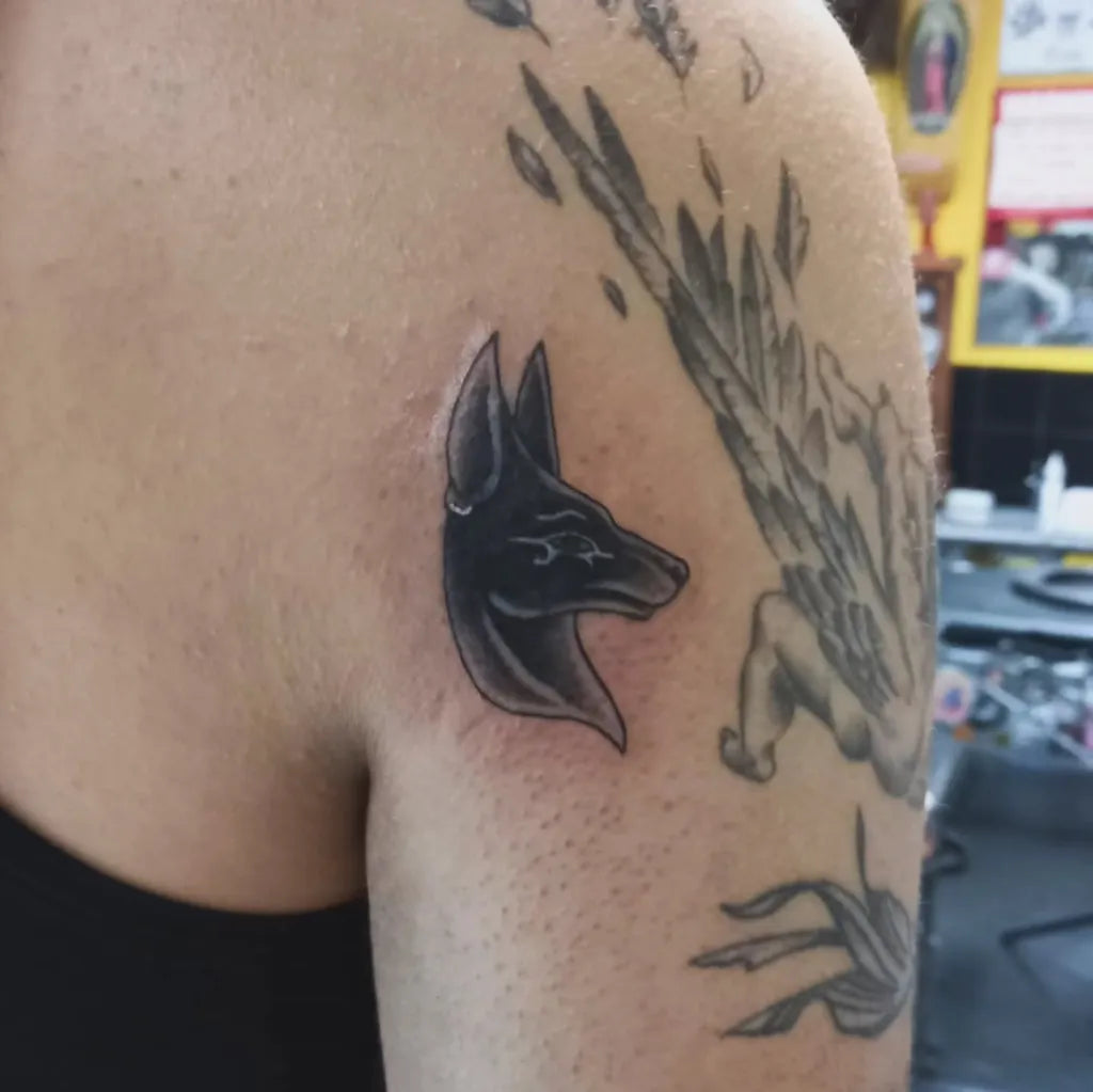 Small Black and Grey Anubis with Wings Tattoo on Women Shoulder by @badbonestattoos