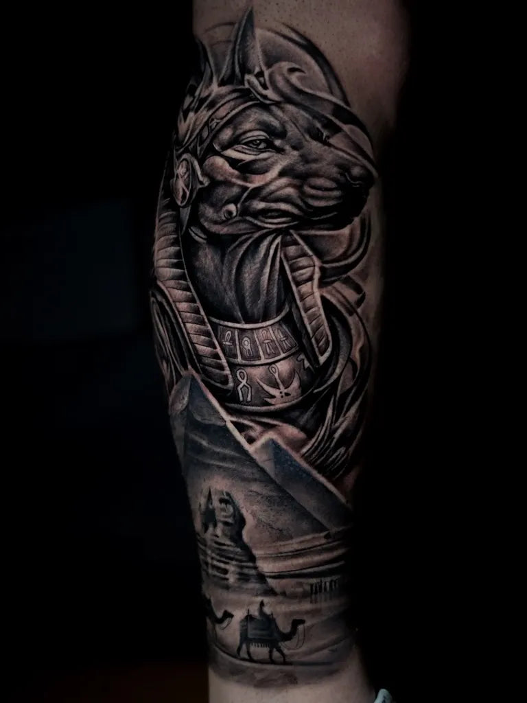 Big Black and Grey Anubis Egyptian Landscape Tattoo on Men Arm by @odiegosamuel