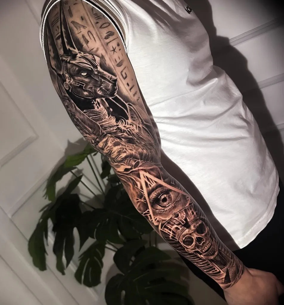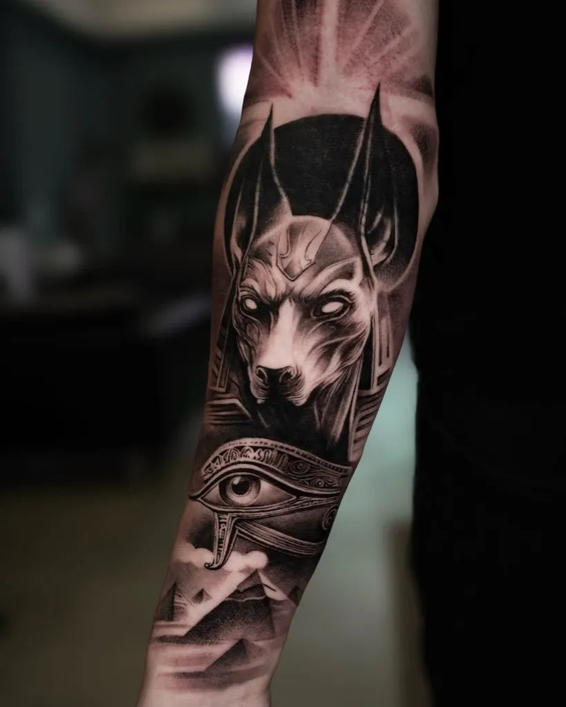Big Black and Grey Anubis Eye of Horus Tattoo on Men Arm by @eddie.puissant