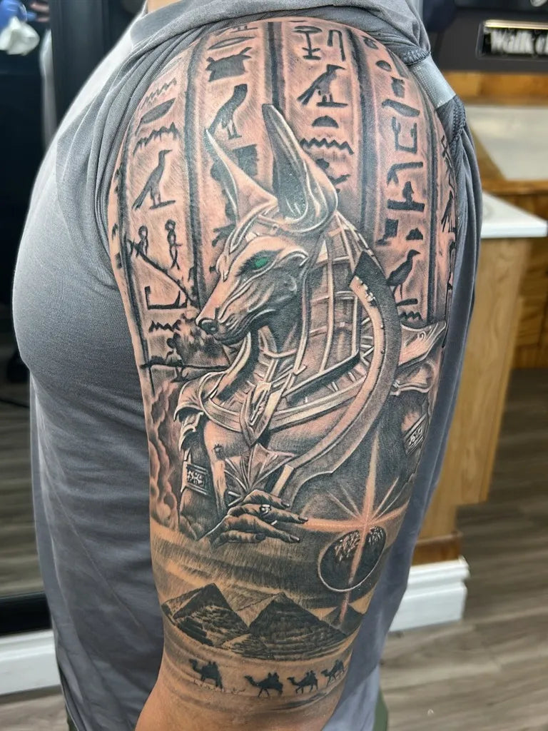 An Anubis tattoo is a striking emblem of protection, transition, and respect for the mysteries of life and death. Inspired by the ancient Egyptian god Anubis—guardian of tombs and guide of souls—an Anubis tattoo often symbolizes safeguarding your path, honoring ancestors, and trusting your inner compass when facing change. With its jackal-headed figure and regal stance, an Anubis tattoo blends myth, spirituality, and bold visual power.