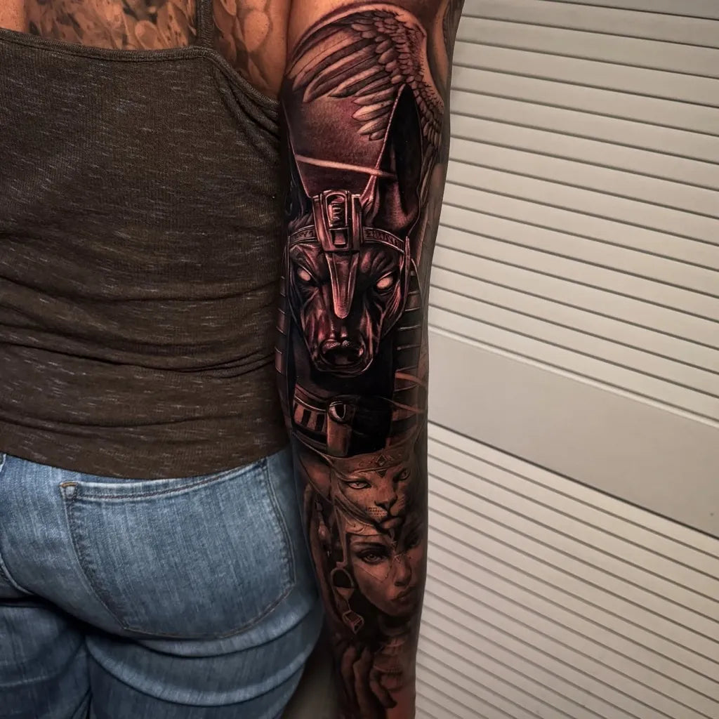 • An Anubis tattoo symbolizes protection, truth, transformation, and reverence for the passage between worlds.