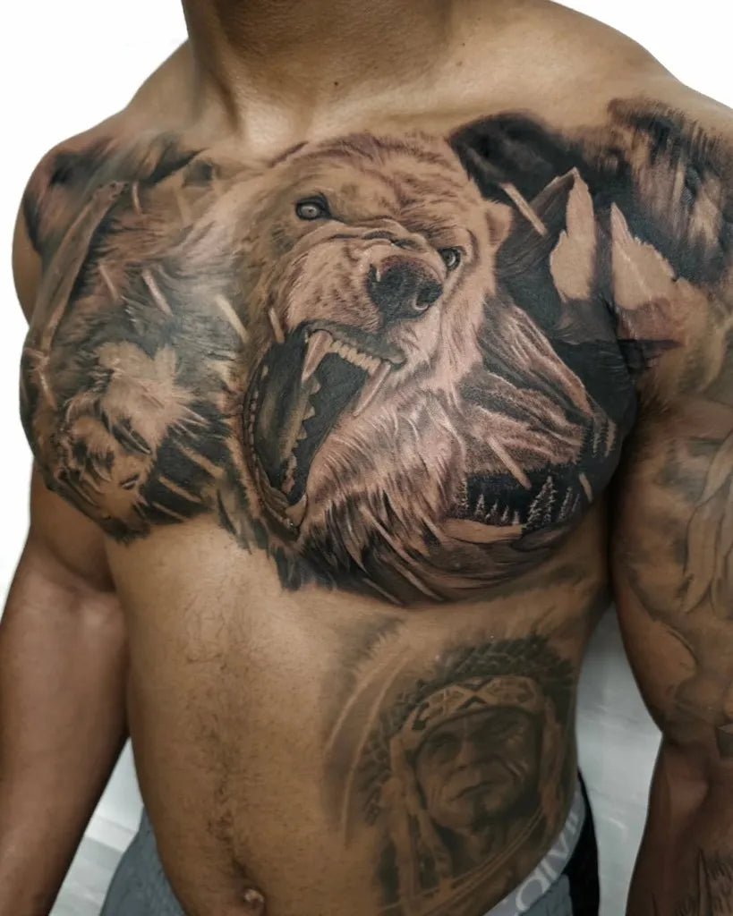 Big Black and Grey Bear Tiger on Men Chest Tattoo by @sambeetattoo