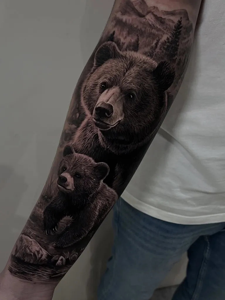Big Black and Grey Bear and Cubs on Men Arm Tattoo by @liyantattooink