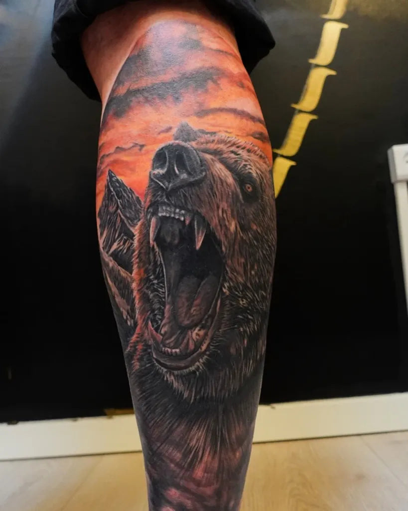 Big Black and Grey Bear on Men Leg Tattoo by @tattoobywilly