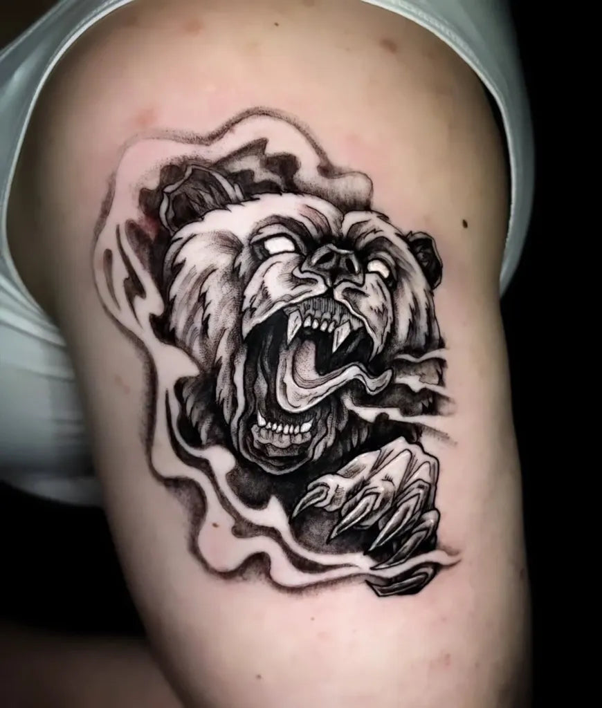 Big Black and Grey Roaring Bear on Men Shoulder Tattoo by @stan__tattoos