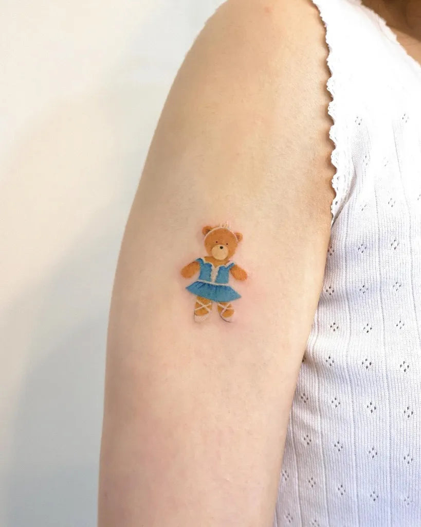 Small Illustrative Ballerina Bear on Women Arm Tattoo by @aol.tattoo