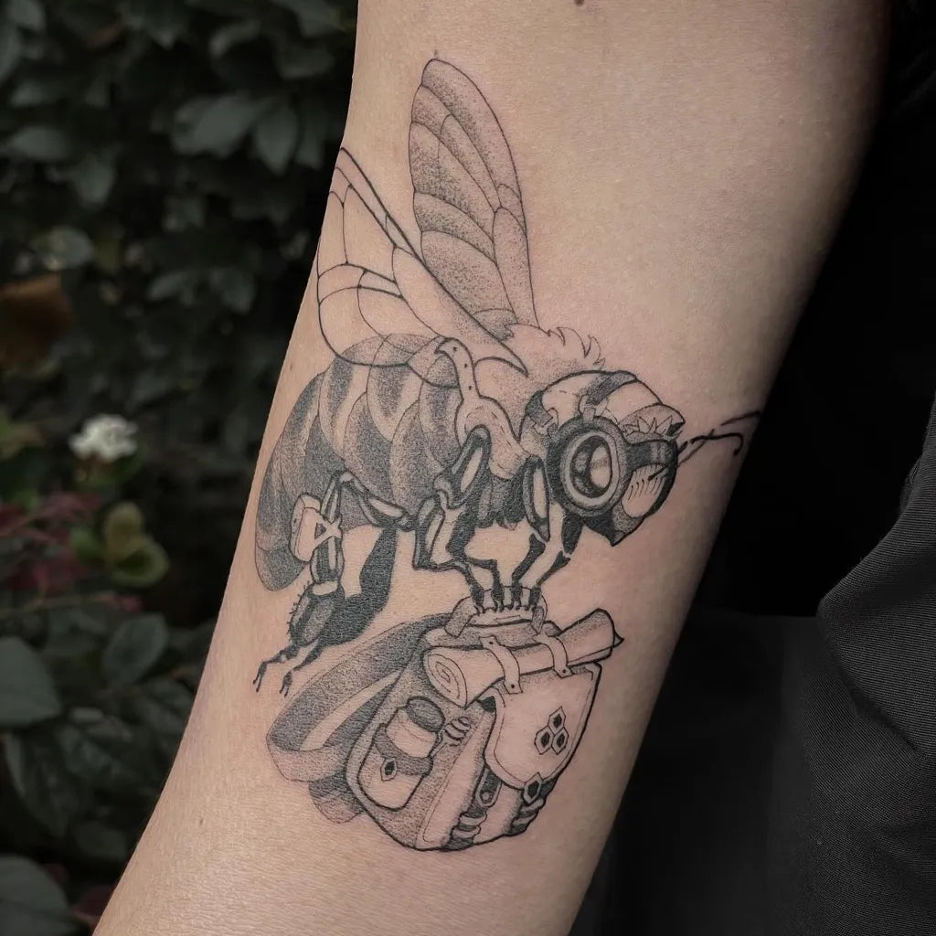Medium Dotwork Bee with Backpack and Goggles on Men Arm Tattoo by @chibi_raccoon_tattoo