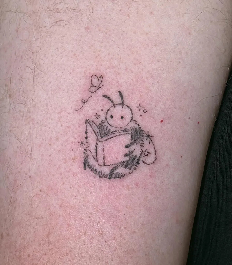 Small Fine Line Bee Reading Book on Women Arm Tattoo by @tinybaki