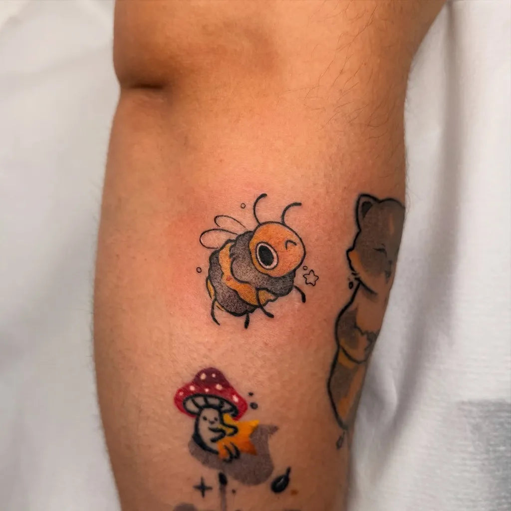Small Illustrative Bee Mushroom Otter on Women Arm Tattoo by @giro.ink