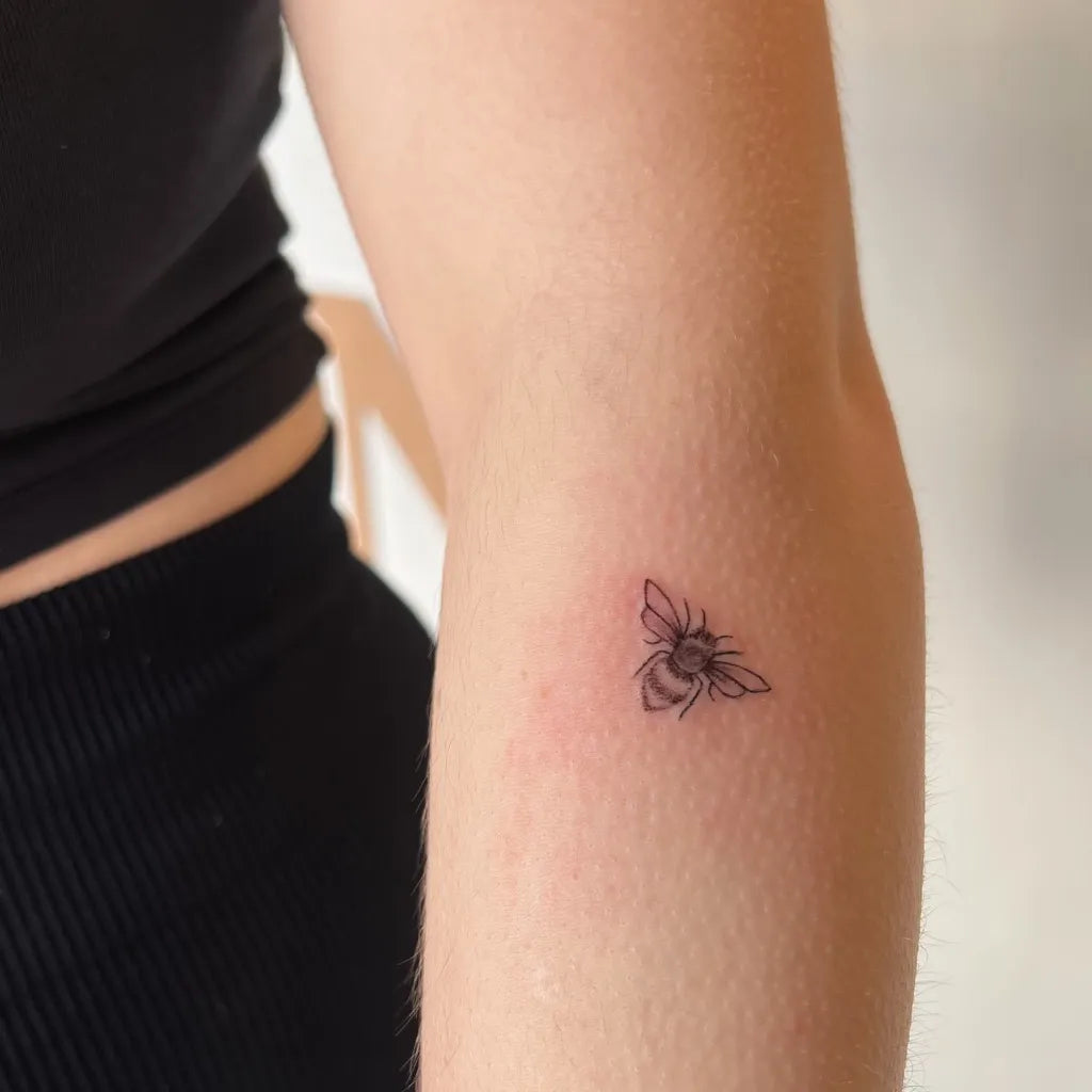 Tiny FineLine Bee on Women Arm Tattoo by @inktuition.111
