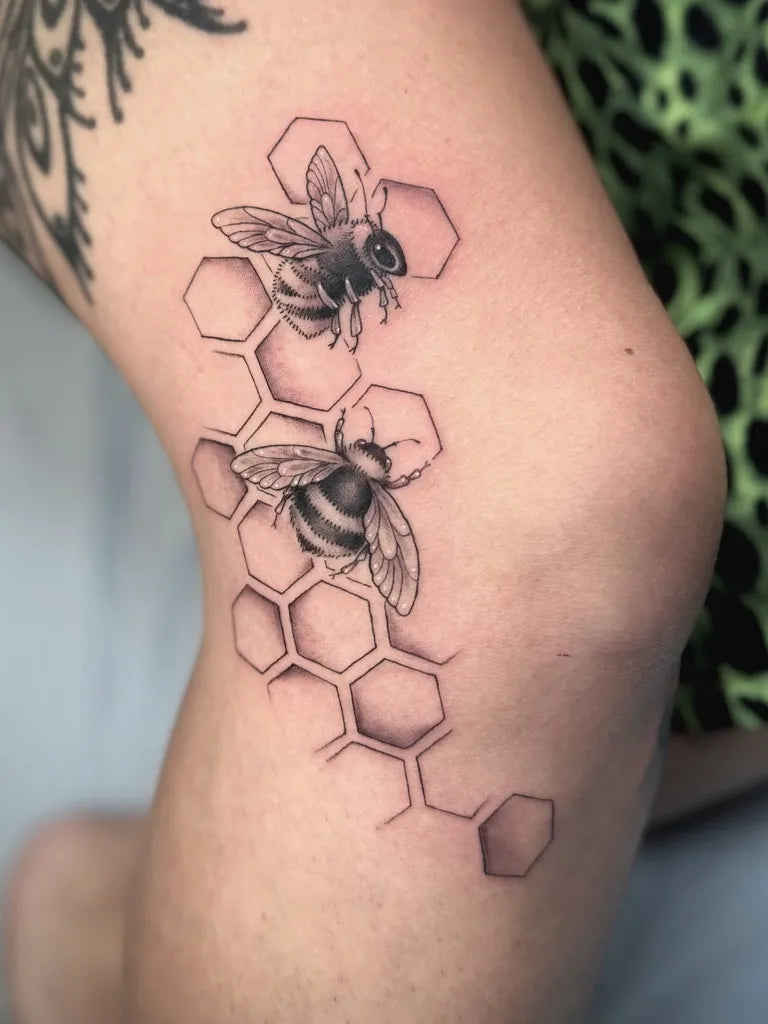Medium Black and Grey Bees and Honeycomb on Women Thigh Tattoo by @taratattooz