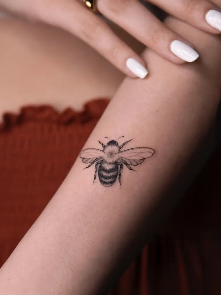 Small Black and Grey Bee on Women Arm Tattoo by @danila_gold_