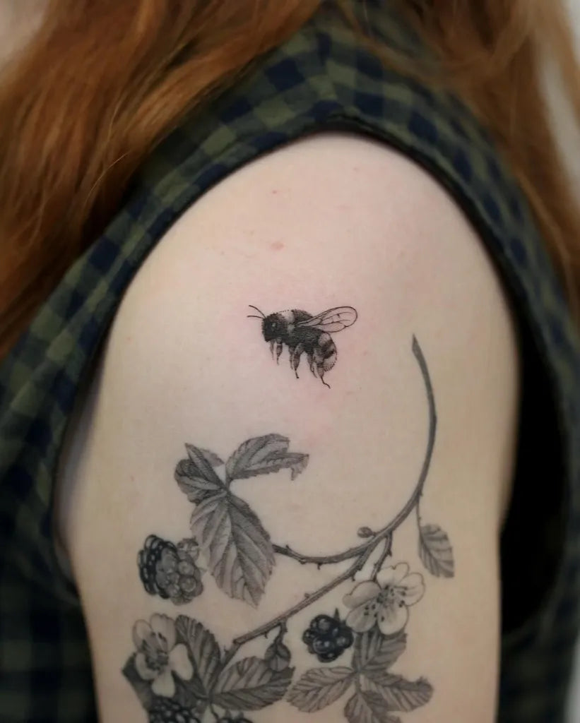 Small Blackwork Bee Blackberry Branch on Women Upper Arm Tattoo by @kyla_rose_tattoo