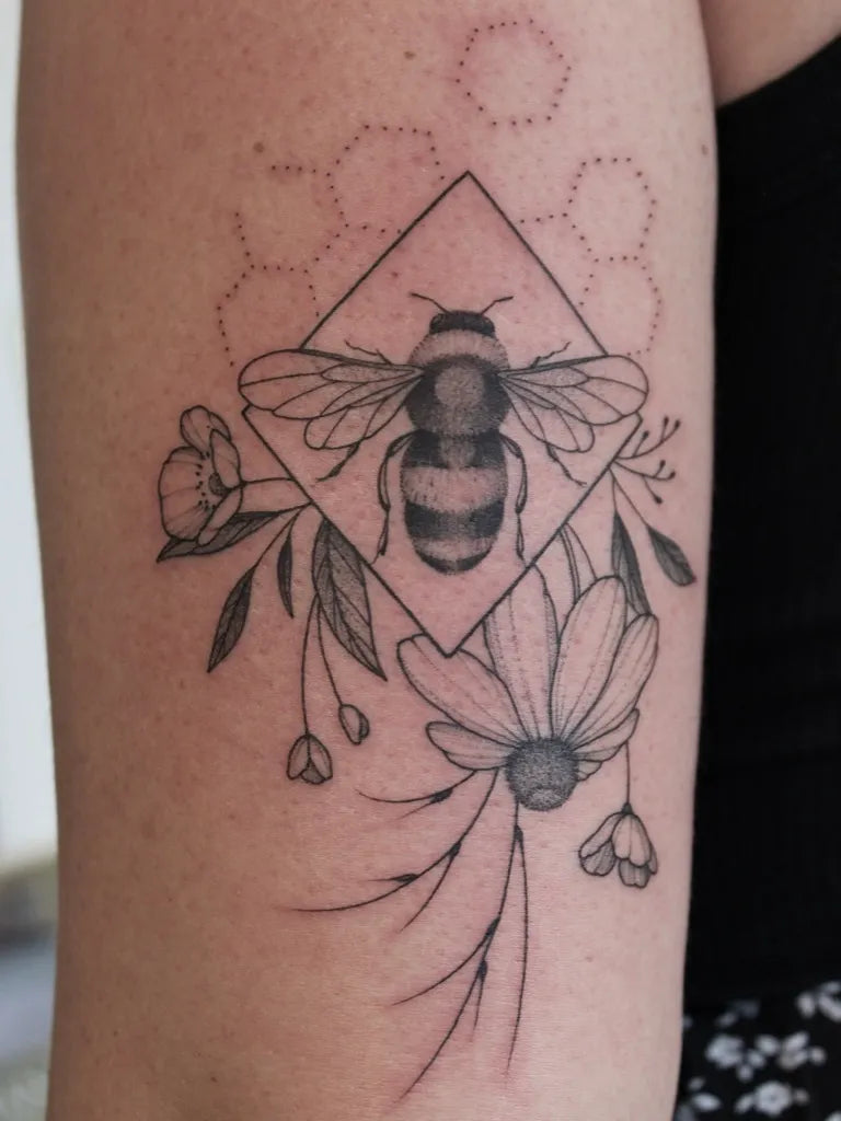 - A bee tattoo symbolizes hard work, community, loyalty, protection, and the sweetness of earned rewards.