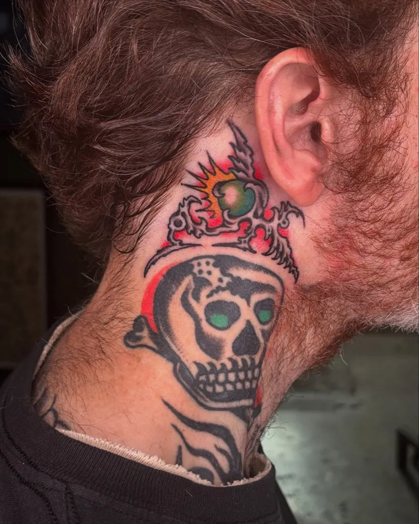 Medium American Traditional Skull with Crown Tattoo on Men Behind the Ear by @lancedennistattoos