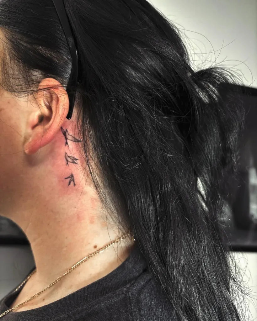 Small Black and Grey Birds Tattoo on Women Behind the Ear by @inkedbyri.kc