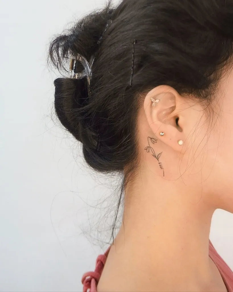 Small Fine Line Lily Flowers Tattoo on Women Behind the Ear by @maye.sh