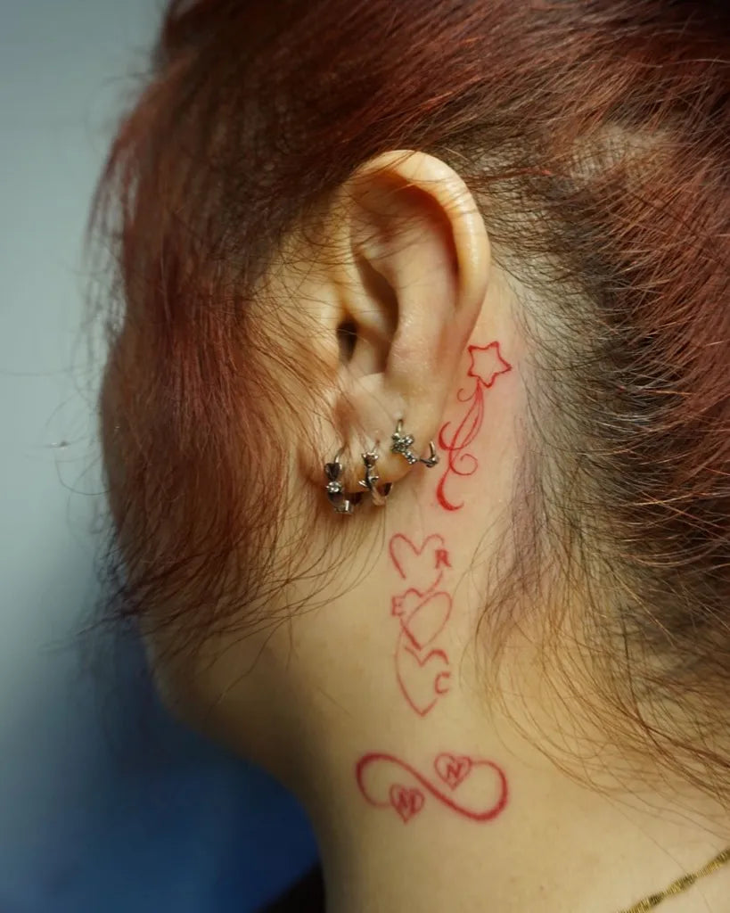 Small Redline Heart Star Infinity Tattoo on Women Behind the Ear by @herwayzz