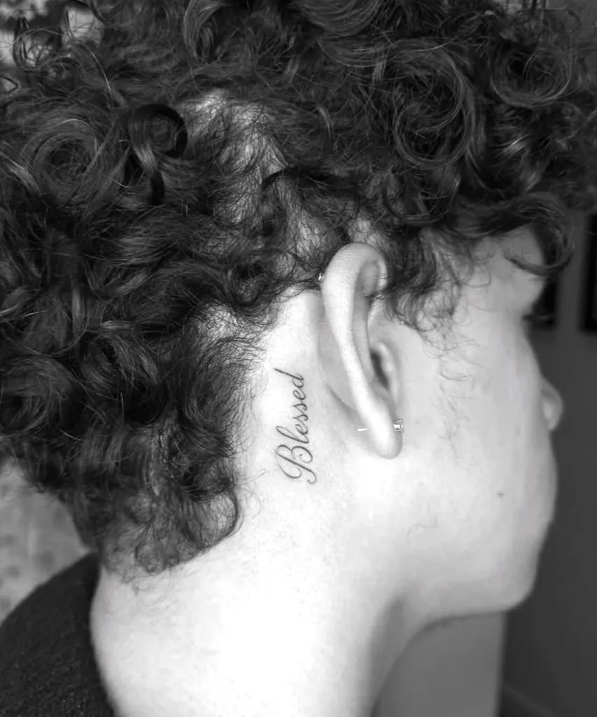 Tiny Fine Line Blessed Word Tattoo on Women Behind the Ear by @trueblue_tattoo