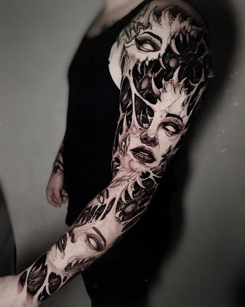 Big Blackwork SurrealFaces on Women Arm Tattoo by @orfen_krakow