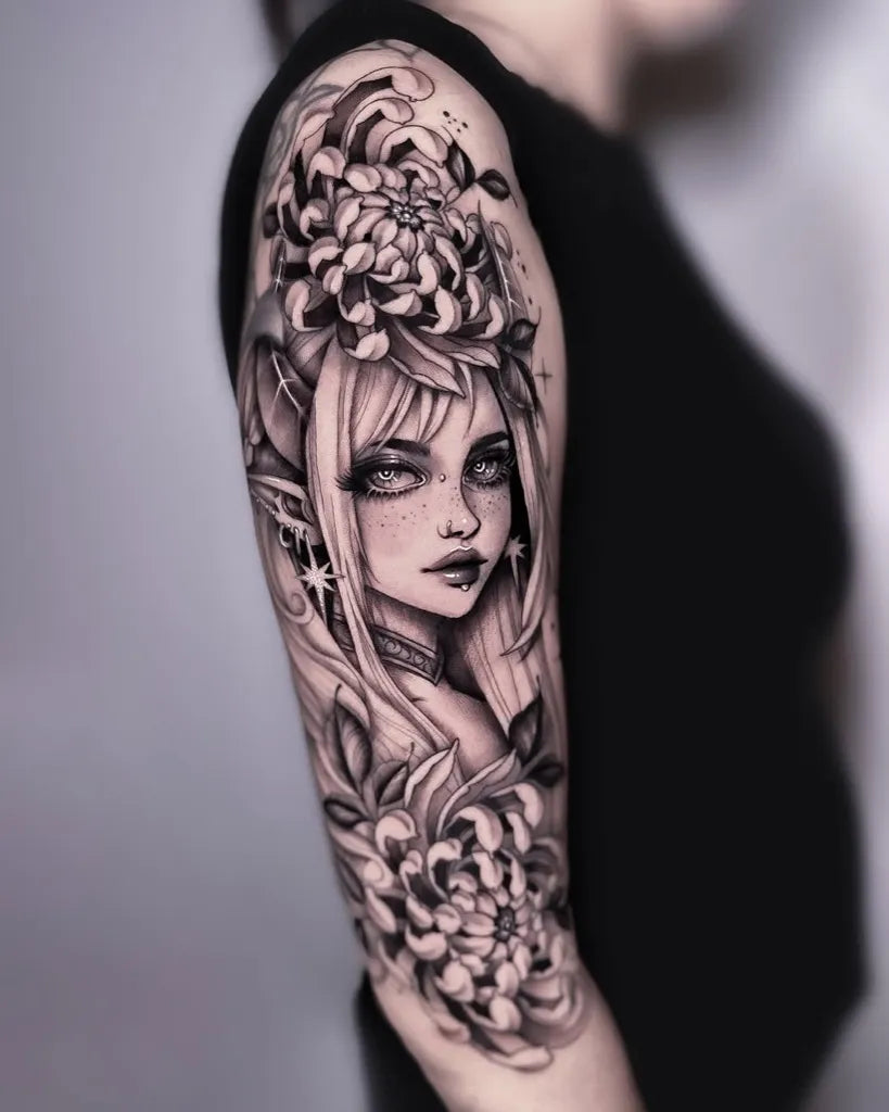 Big FineLine ElfGirlWithChrysanthemums on Women Arm Tattoo by @tattooassist