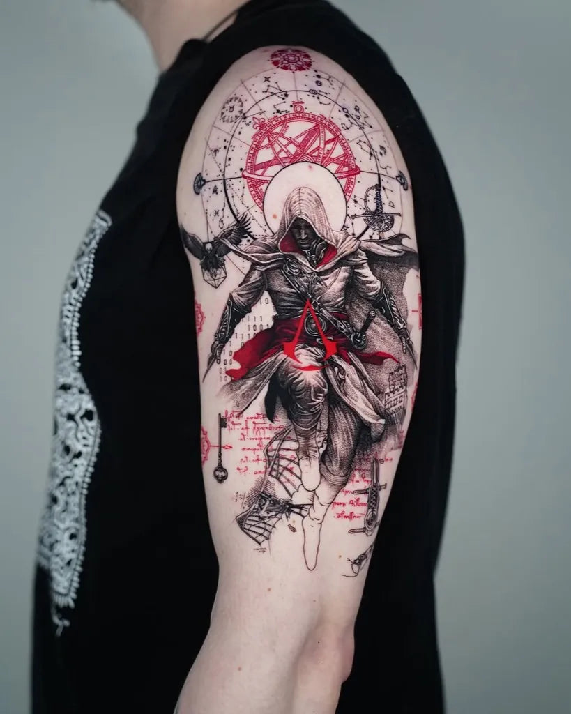 Big Neo Traditional Assassins Creed Character on Men Arm Tattoo by @tattooassist