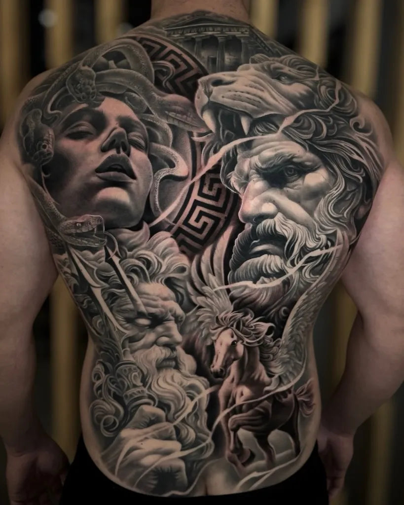 Big Neoclassical Mythological Figures on Men Back Tattoo by @alepekas_tattoo