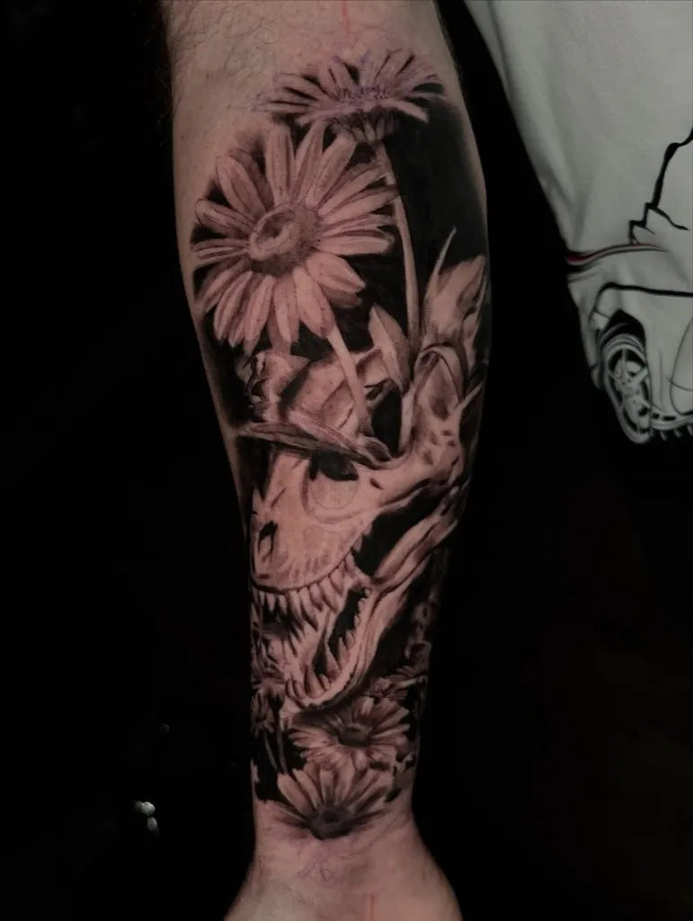 Big Black and Grey Daisy Skull Dinosaur Tattoo on Men Arm by @danteytattoo