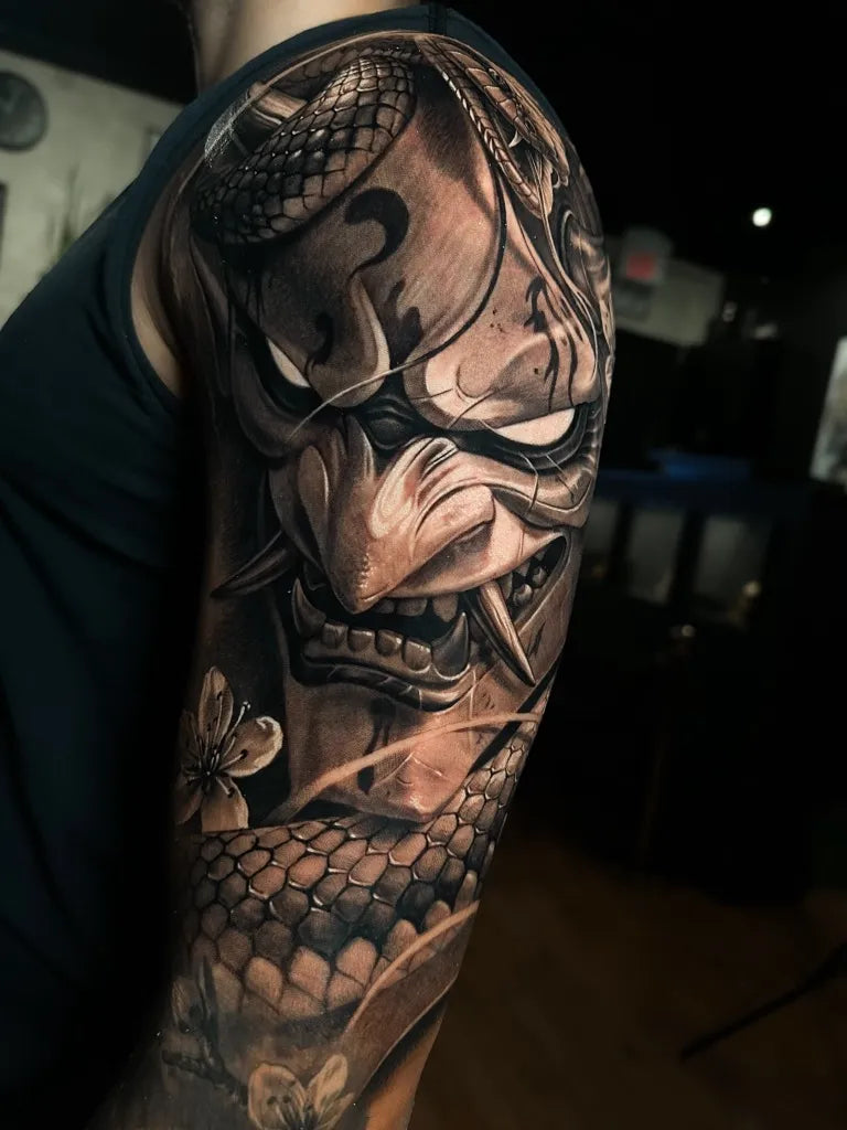 Big Black and Grey Hannya Mask with Snake and Flowers Tattoo on Men Arm by @salahtattooart