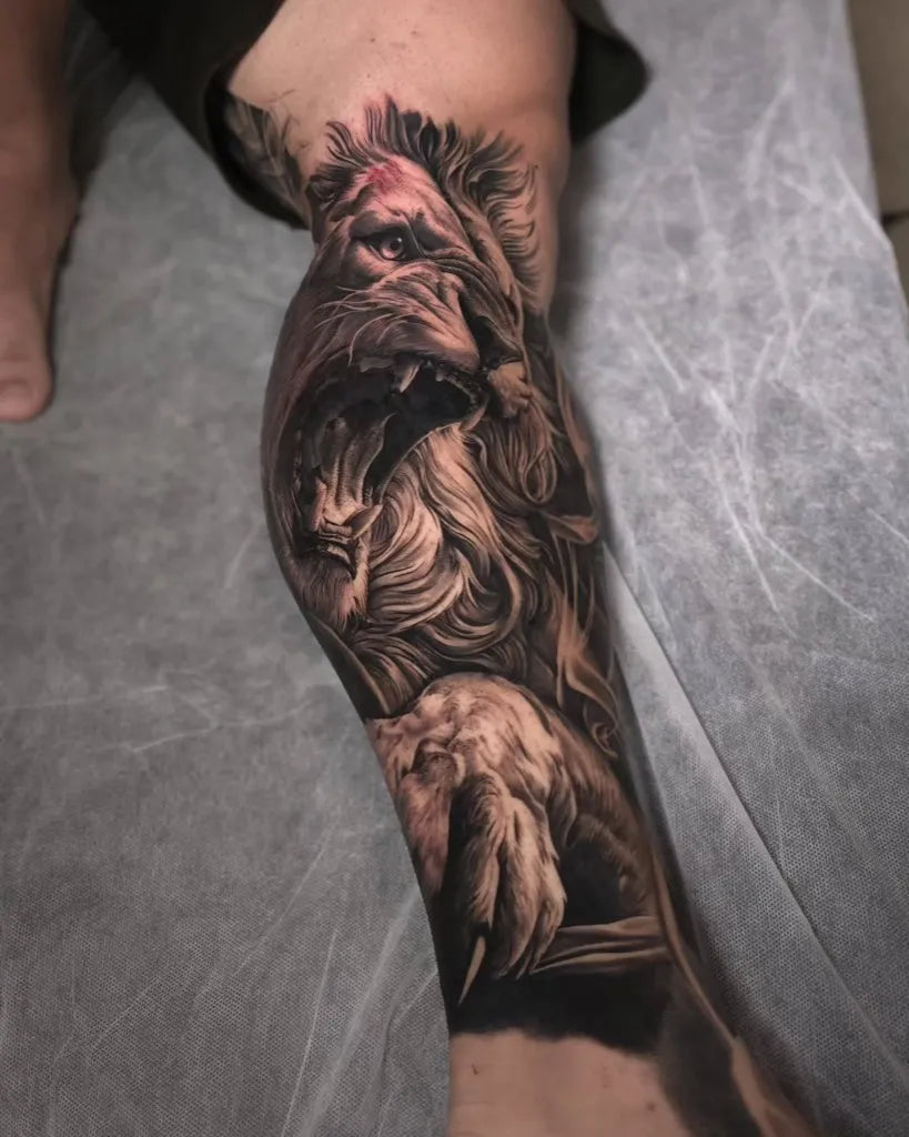 Big Black and Grey Roaring Lion Tattoo on Men Leg by @liamjeytattoos