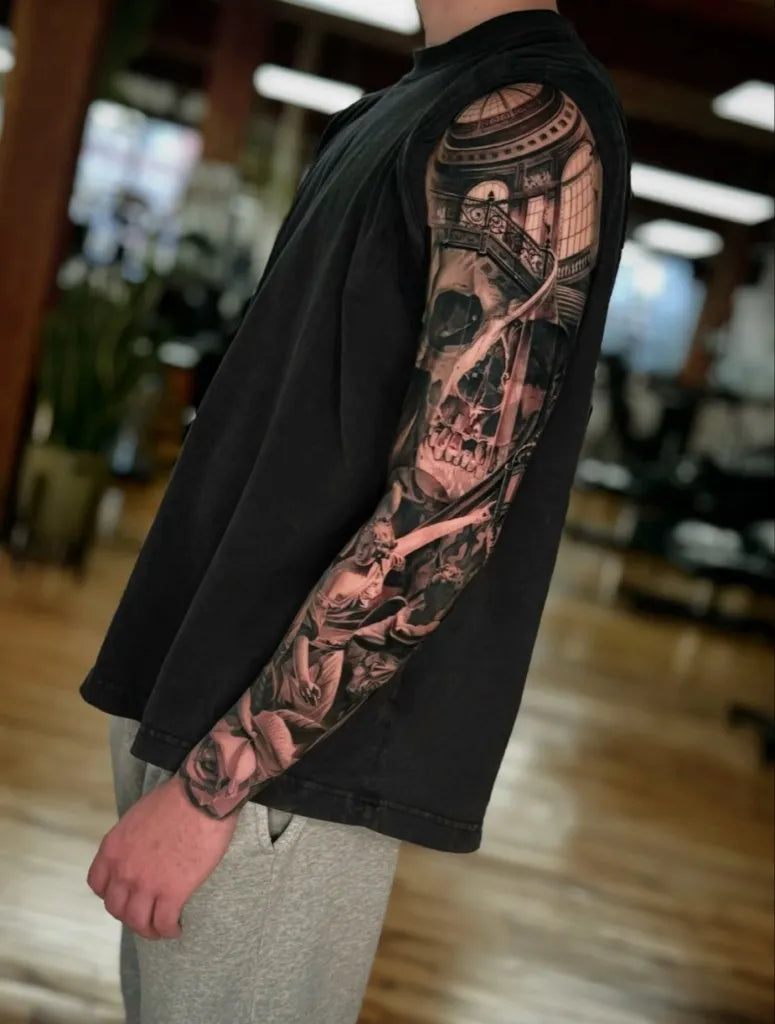 Big Black and Grey Skull and Roses Tattoo on Men Arm by @lamanigancetattootoronto