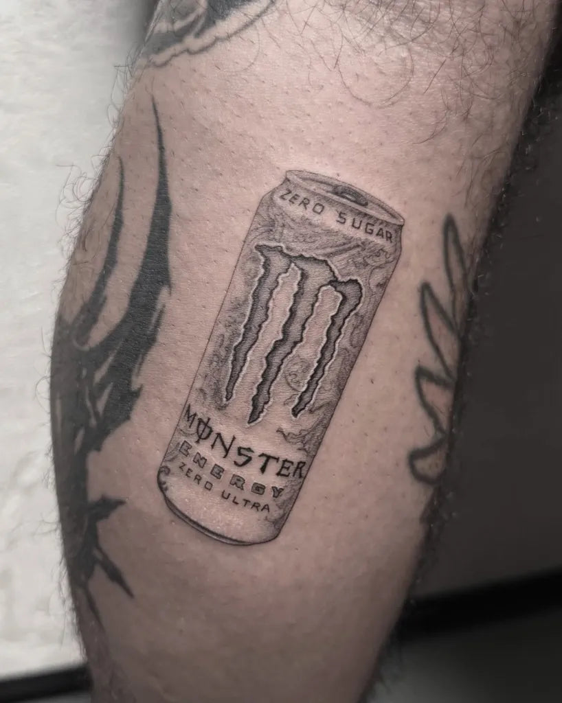 Small Black and Grey Monster Energy Can Tattoo on Men Leg by @vanytintenherz