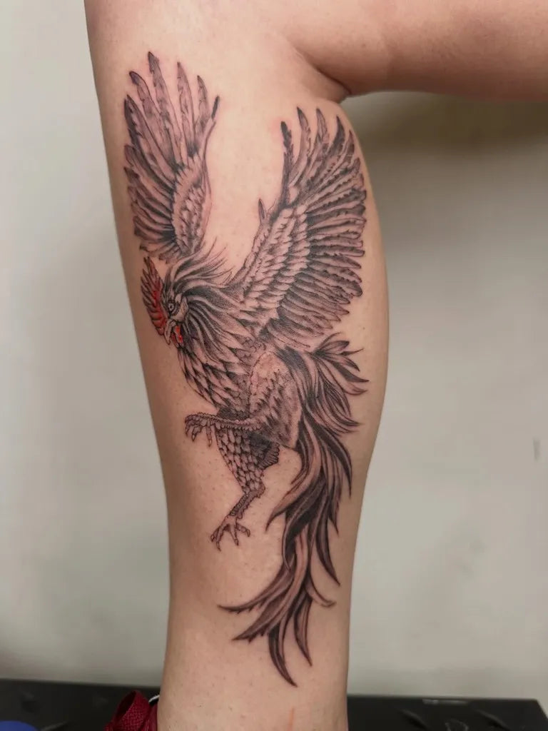 Big Black and Grey Flying Rooster Tattoo on Women Calf by @james_miner_tattoo