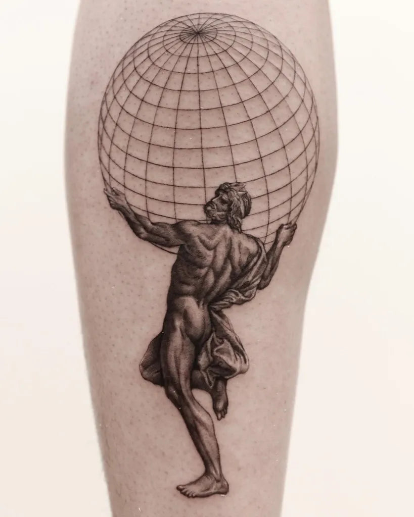 Big Blackwork Atlas Holding Globe Tattoo on Men Calf by @quindaytattoos
