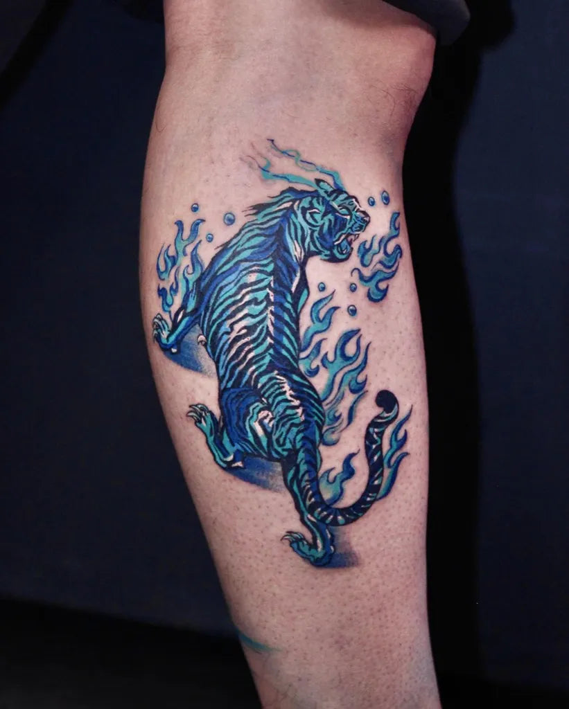 Big Irezumi Blue Tiger with Flames Tattoo on Men Calf by @melange.tattoo